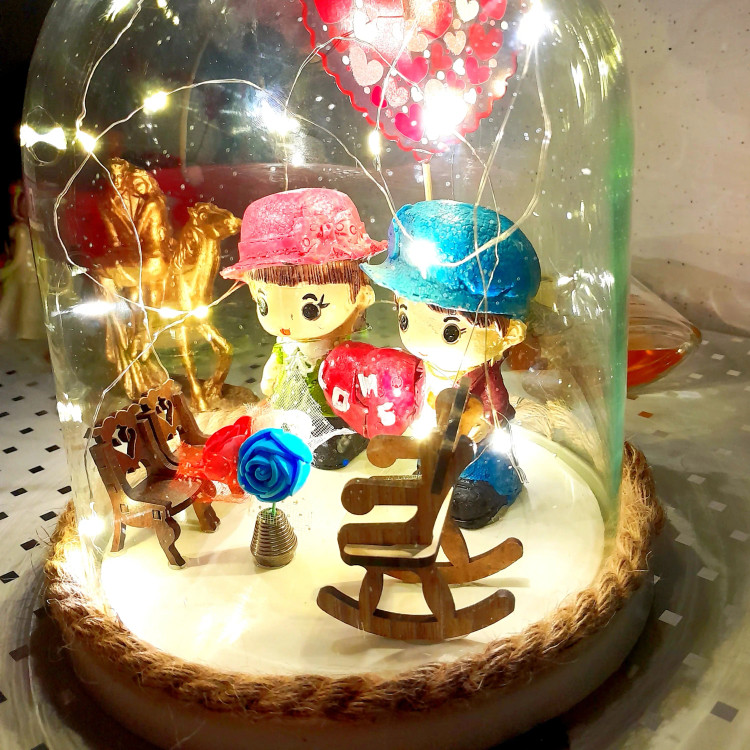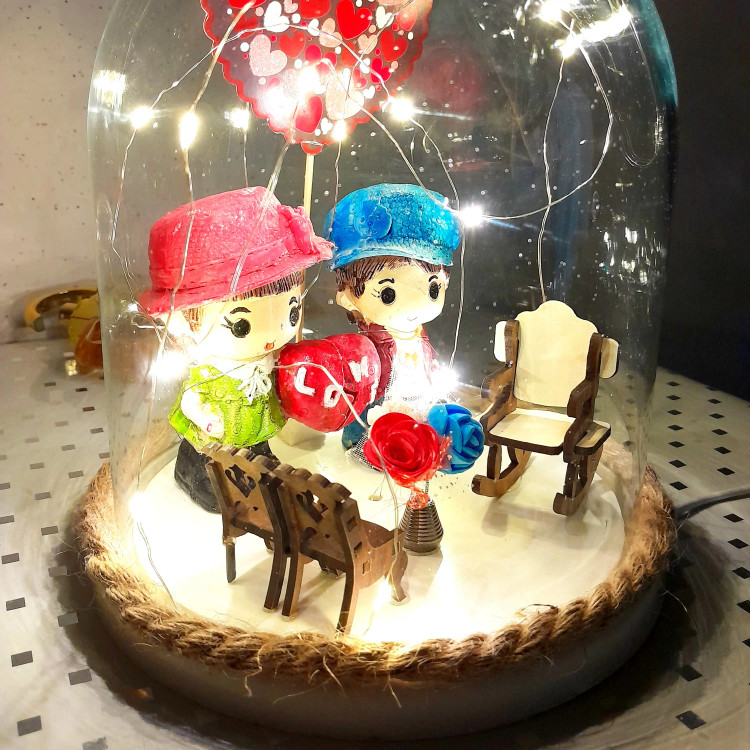 باکس هدیه عاشقانه طرح دختر پسر میز وصندلی دار وچراغدار شیشه فلکسی باتری خور وusbخور لامپ ریسه ای