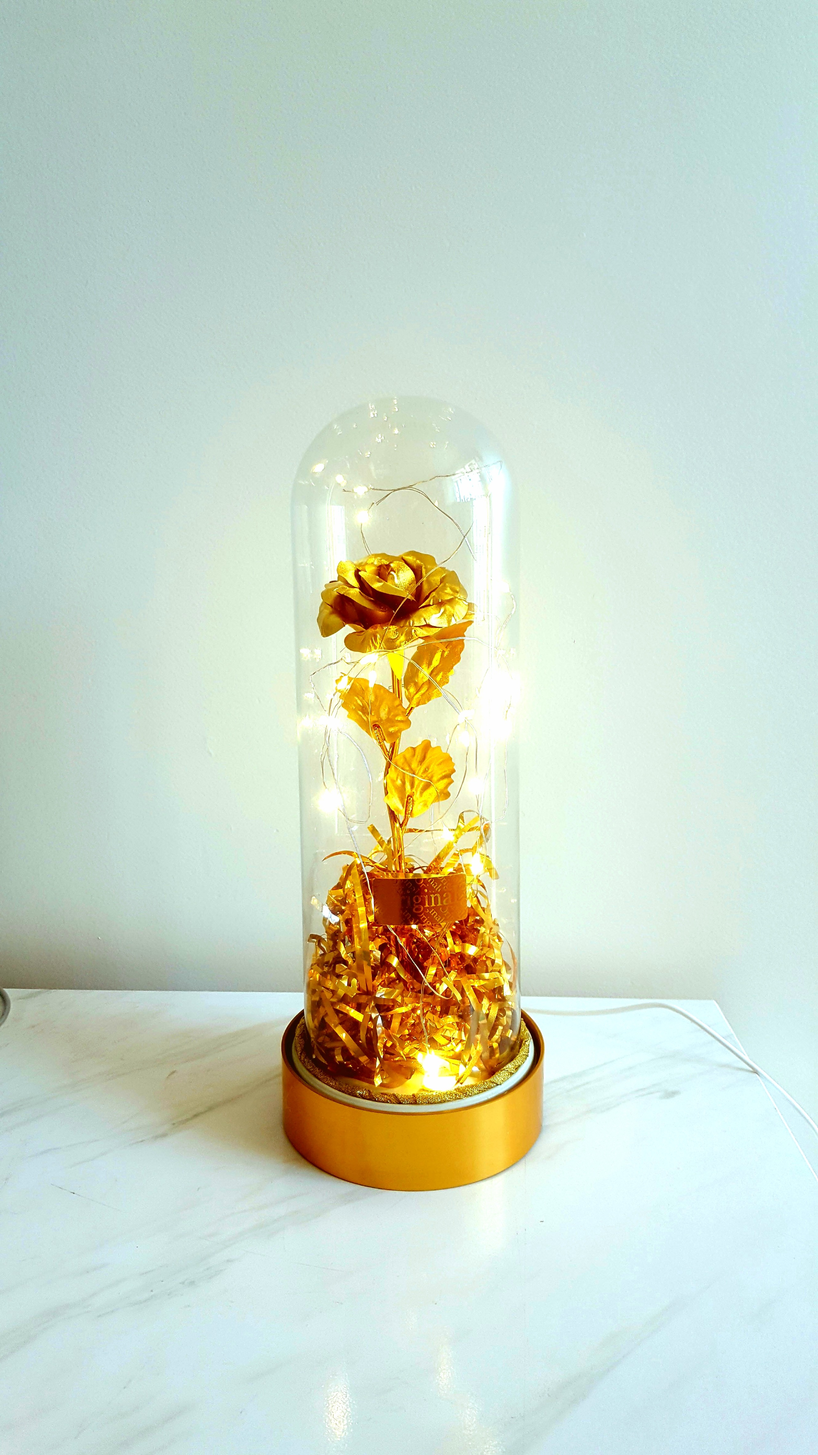 باکس گل رز طلایی شیشه ای چراغدار