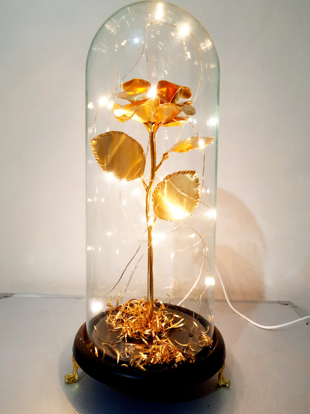 باکس هدیه شاه گل رز طلایی برنج پایه دار شیشه فلکسی استوانه